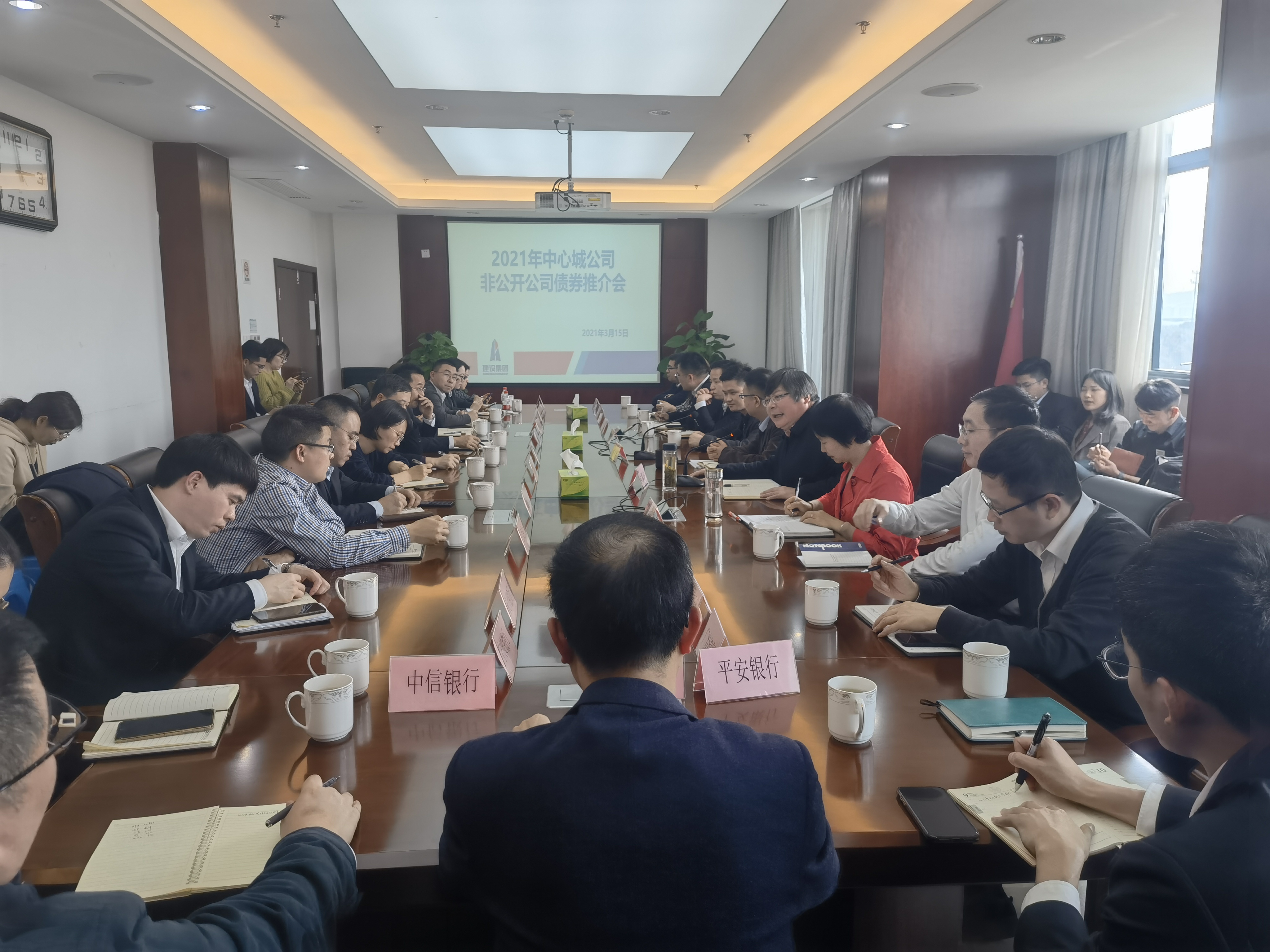 3月15日下午,區建設集團召開中心城公司2021年非公開公司債券推介會。集團總經理施林濤、副總經理包震東、浙商證券投行經理楊文生及工、農、中、建等21家銀行、浙商證券項目組和集團融資部共40余人參加會議。