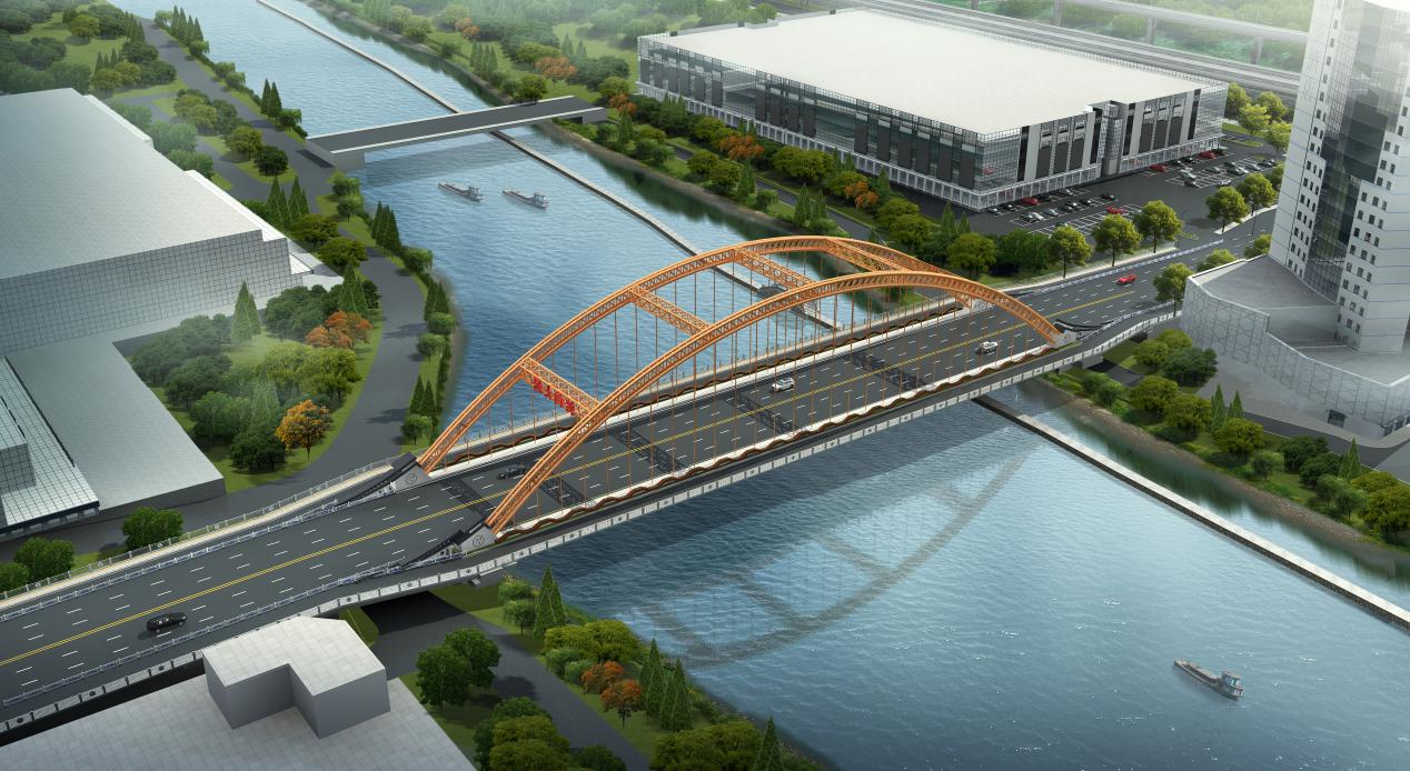 金柯橋大道104國道口輕紡城大橋改建工程范圍南起104 國道,北至萬商路,全長552.38m,采用雙向六車道城市主干路標準,設計速度50km/h,總投資約1.4億元。工程內容包括新建一座跨越運河的鋼管砼系桿拱梁主橋,對現(xiàn)狀獨山地道進行入口改造,新建東升路地下人行通道聯(lián)通市場東西,大橋南北引橋下各建設一條下穿過路。